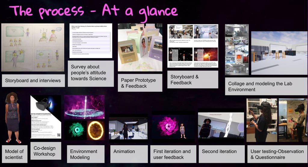Above is a summary of the process I followed to create the VR piece. I used User Centered Design and Participatory Design methodologies to complete this project. I started with a storyboard and held interviews with some STEM education experts to talk about my project area which was problems in the current system of K-12 STEM education. Then I surveyed people about their attitude towards science. I made a paper prototype for my project idea and got some feedback from my peers and undergraduate students. I created two storyboards on two scientists and their work and got some middle school student’s feedback on which of the scientists' work they found more appealing. I created collage for the lab and used it to model the environment. I created a 3D model of the scientist. I held a co-design workshop with undergraduate students at NYU and got their feedback on my progress. I modeled the outer space environment. I created animations. I developed the first iteration of the experience which was the lab and outer space and got some feedback from VR experts and teachers. I developed second iteration which included the interactive activity. I held user testing sessions with middle school students and made observations as they tried out the experience. I also asked them to fill out a questionnaire to get some qualitative feedback on my project.